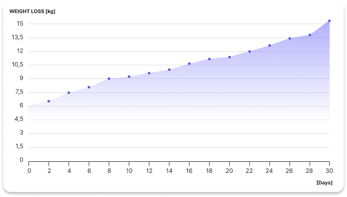 - Kaalulangus vähemalt 15 kg 30 päeva jooksul